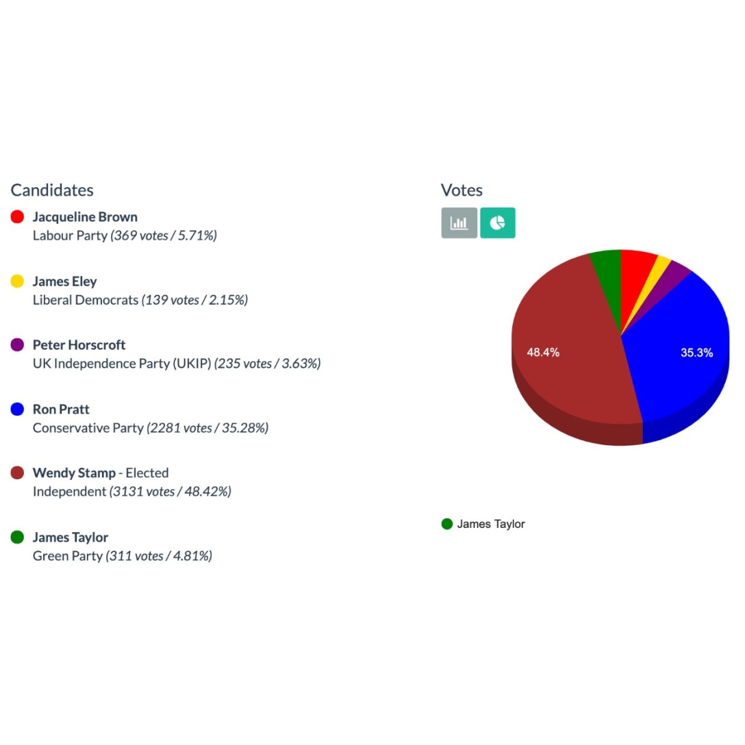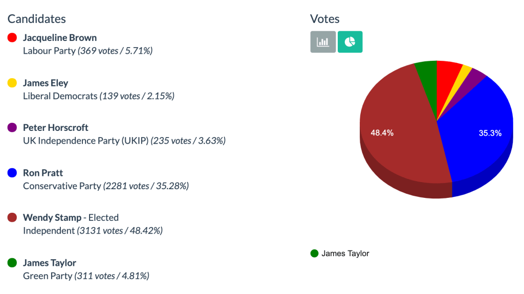 Well done to the victor, independent Wendy Stamp, a great victory over the incumbent Conservative candidate and I wish her the best of luck in continuing to put residents first for a caring, biodiverse, resilient, zero-carbon and nuclear-free Dengie.