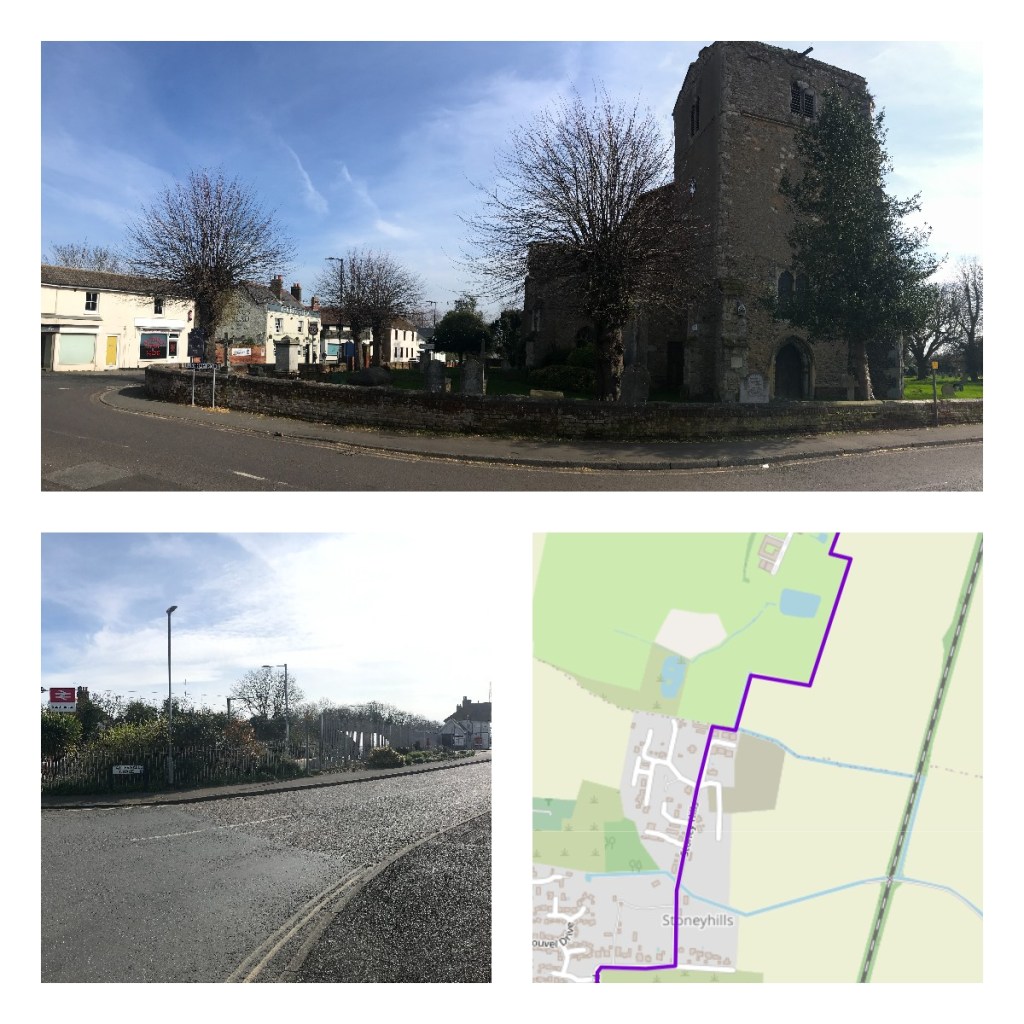Mill Road has no pavement, so it’s road walking here but it’s a low-traffic route. A road sign for Stoney Hills indicates where to make a left turn. Do not be put off by signs indicating this is a private road as this is a public right of way. This straight road goes largely north, when a westerly bend appears, a public footpath carries on northwards. The path is canyoned between privacy fencing and is wide enough. When the housing on either side peters out there’s a right angle turn eastwards along a fence line, don’t carry on north here onto a private track belonging to Ratsborough Farm.