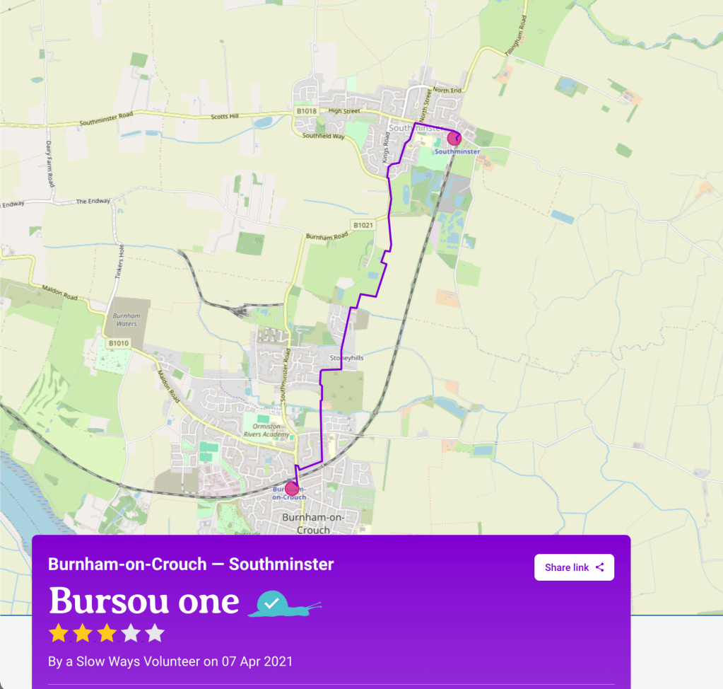 Yesterday, I walked from Burnham to Southminster as a #SlowWays wayfarer on the Slow Ways route Bursou One. I’m a big fan of this project and signed up as a wayfarer to help create a network of walking routes connecting Great Britain. It’s also a useful lens through which to examine the local walking provision (‘Bursou One is one of three footpath-orientated routes between Burnham and Southminster – I covered the other two in an earlier post]).