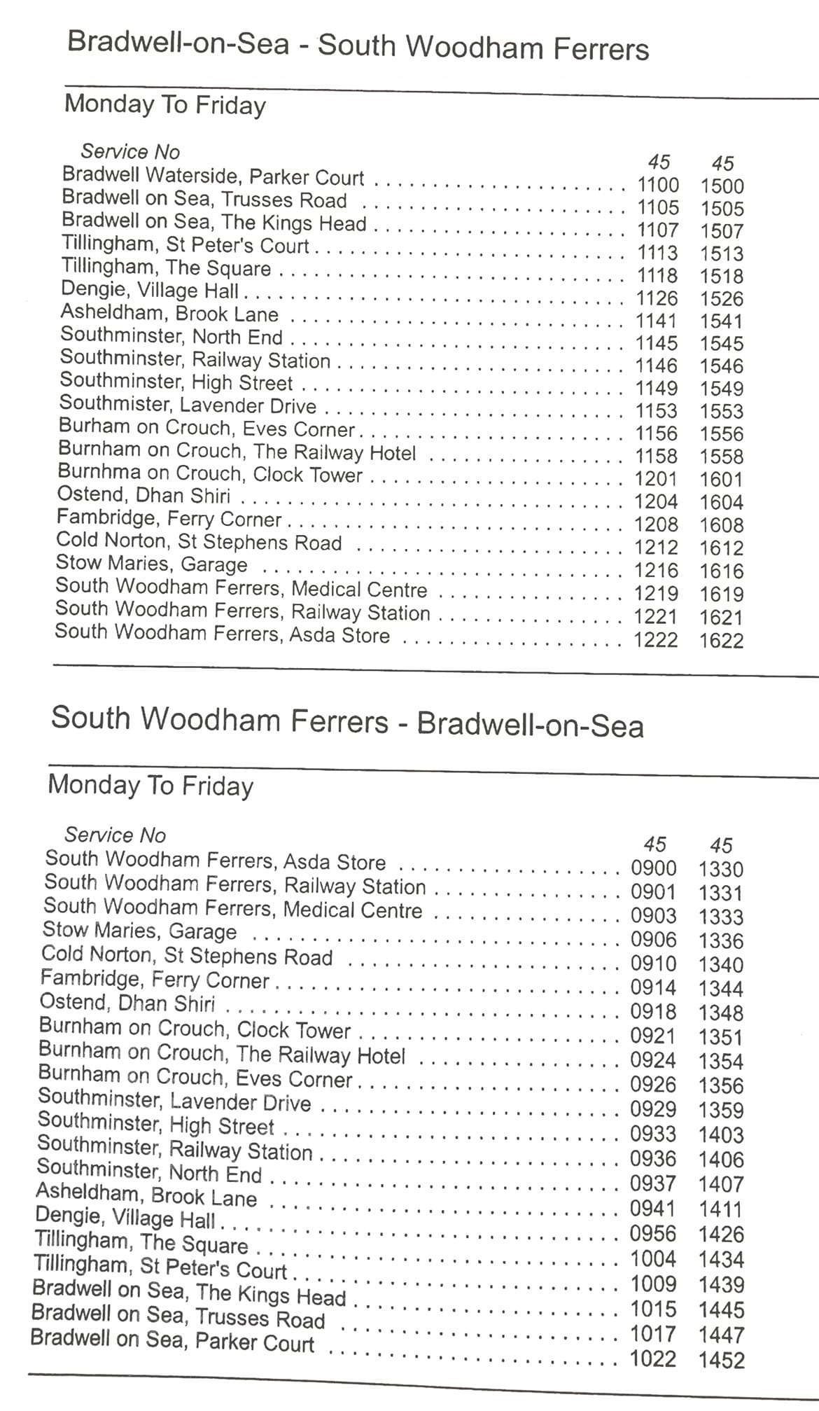I went out to my local bus stop, which is on the route, to see if the 45 came in at 13.51 (the 13.30 bus from Woodham) – it didn’t. I was there 5 minutes before and for 15 minutes afterwards. It is 26c in the shade right now, let’s hope no one vulnerable is waiting outside at some rural stop for this bus. The timetable at my bus stop still shows the D4, it hasn’t been changed yet. Google Maps, bustimes.org and the TravelEssex app no longer feature the D4 and they don’t give the 45 times either. Stephenson’s website has no information about the service and their Facebook page hasn’t been updated for 14 years.