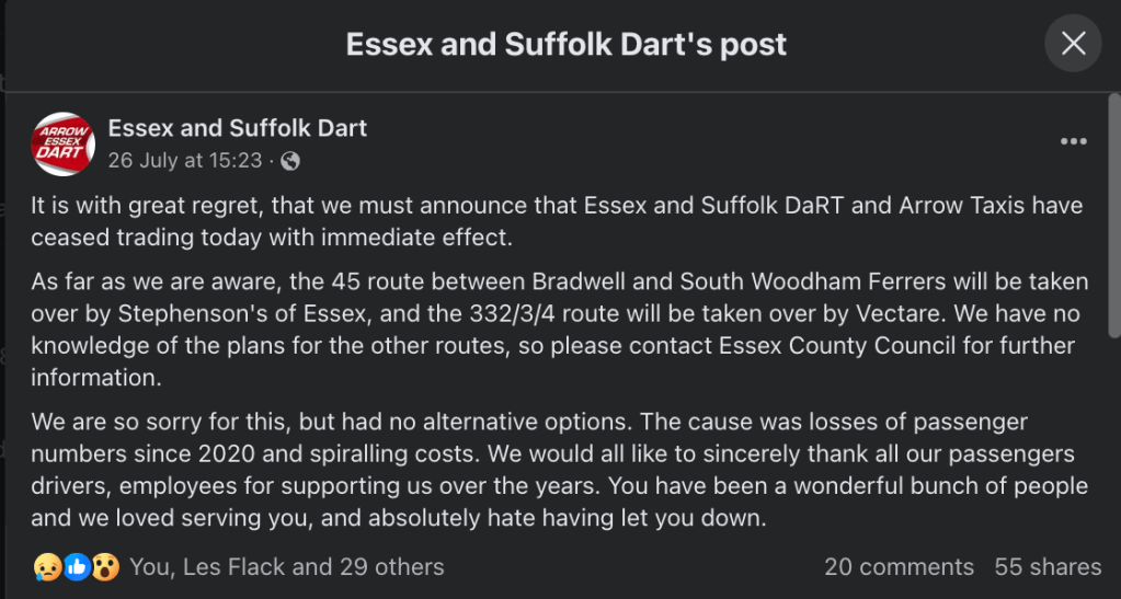 It is with great regret, that we must announce that Essex and Suffolk DaRT and Arrow Taxis have ceased trading today with immediate effect.