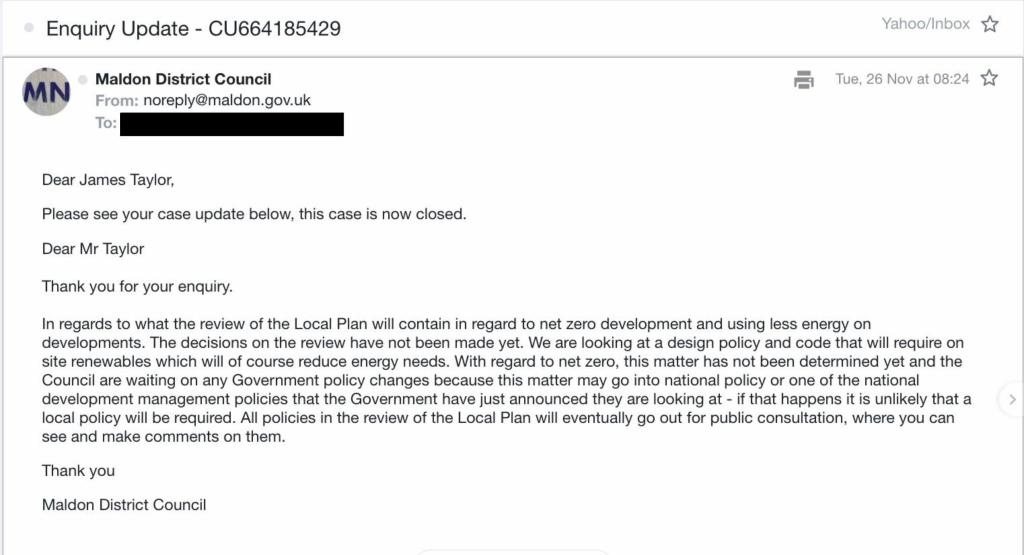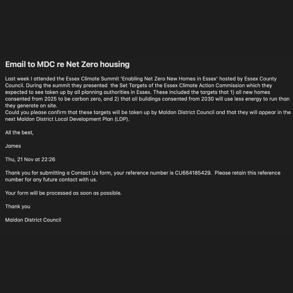 I found MDC’s reply disappointing, dispiriting and inconsistent with the ambition and leadership the Summit suggested was present in Essex. Contrary to the bold direction and climate leadership voiced at the Summit, it said ‘decisions… have not been made yet’ and ‘this matter has not been determined yet’.