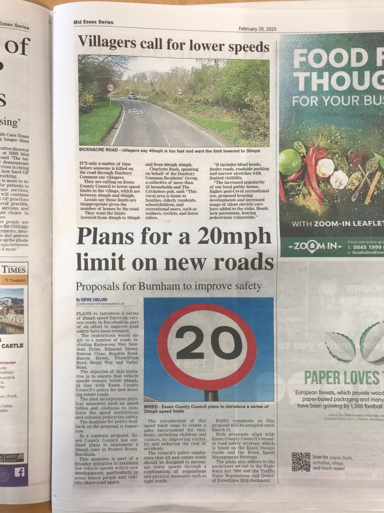 The Maldon & Burnham Standard featured a news story about 20mph speed limits for the new estates in Burnham-on-Crouch. I’d already heard it mentioned at the last council meeting, but there and on FB there were many comments on how it would be policed – the same way all speed limits are policed, I presume?
