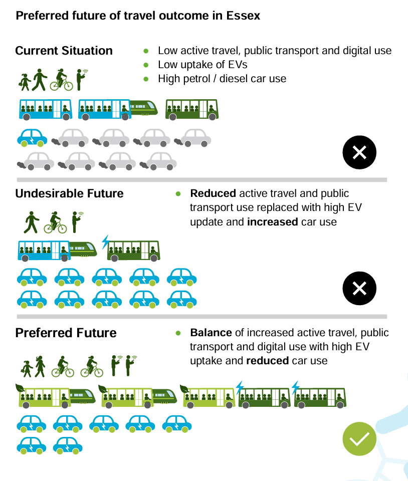‘EV use and infrastructure will need to integrate with, and promote, the wider transport mix in Essex by applying our preferred approach and preferred outcome’, remarking in particular a preference for ‘Improving and promoting Active Travel for all’