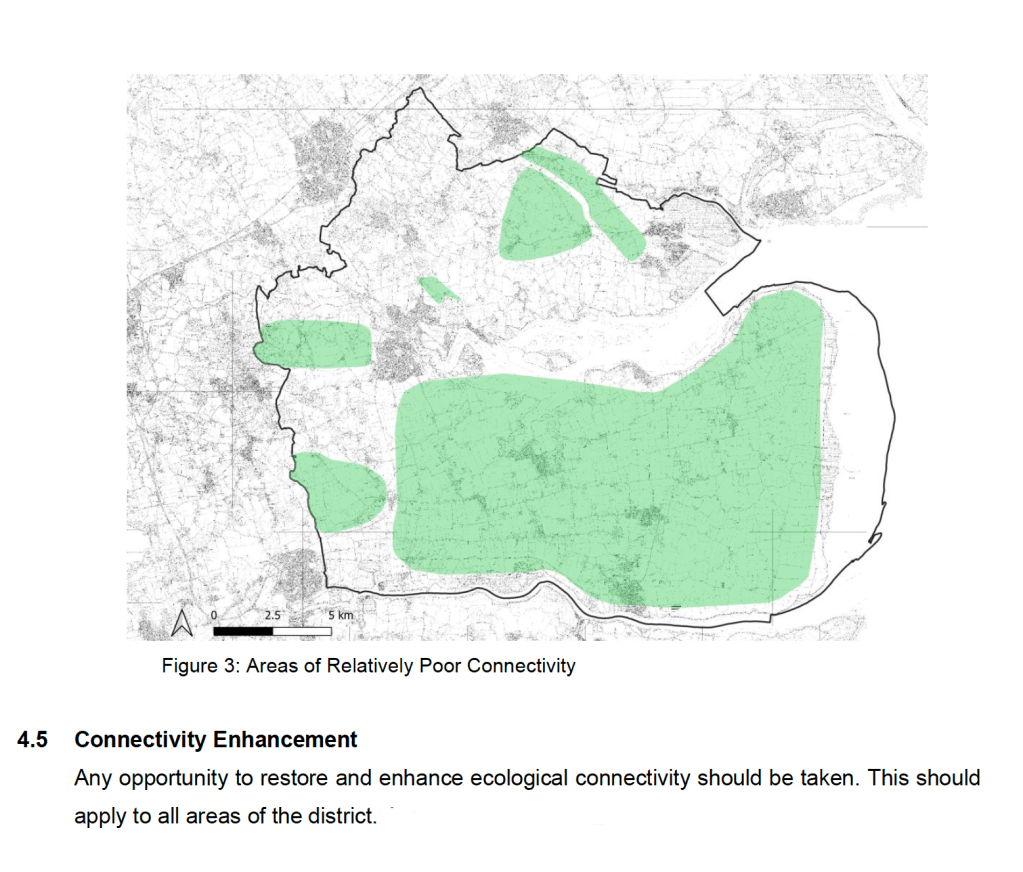 The Maldon Nature Conservation Study (February 2023) produced by Essex Ecology Services (EECOS) for MDC spoke of the importance of wildlife corridors in the district and stated that ‘[t]he taking of measures to enhance connectivity would be worthwhile anywhere in the district… Certain areas suggest themselves as potential priority targets… Any part of the Dengie peninsula‘