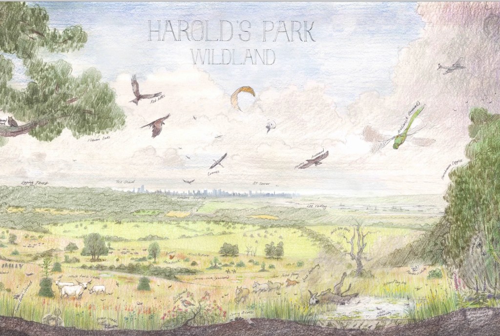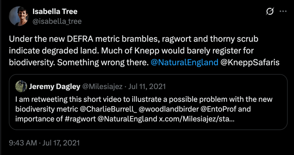 Instead of enforcing these commitments and penalising developers who fail to adhere, the BNG system surrenders and turns this all into a one-off transaction. Developers pay some ecologists to do a baseline survey before development, a wonk does some sums to account for 10% BNG, they pay a one-off fee to a mediator like Bidway and they’re done – on to the next one. The mediator creams some agency fees and passes on the remainder to a land owner adding BNG to their diversifed income streams. It could be a conference and wedding venue like Braxted Park, it could be elsewhere in Essex like the farm turned rewilderness Harold’s Park – 45km as the turtle dove flies from Braxted Park. (Recently purchased by ‘natural capital and rewilding company’ Nattergal.) These Essex projects stand in the shadow of the Knepp estate in Sussex -the poster child for UK rewilding – although Knepp’s owner Isabella Tree says it wouldn’t meet the DEFRA metrics.