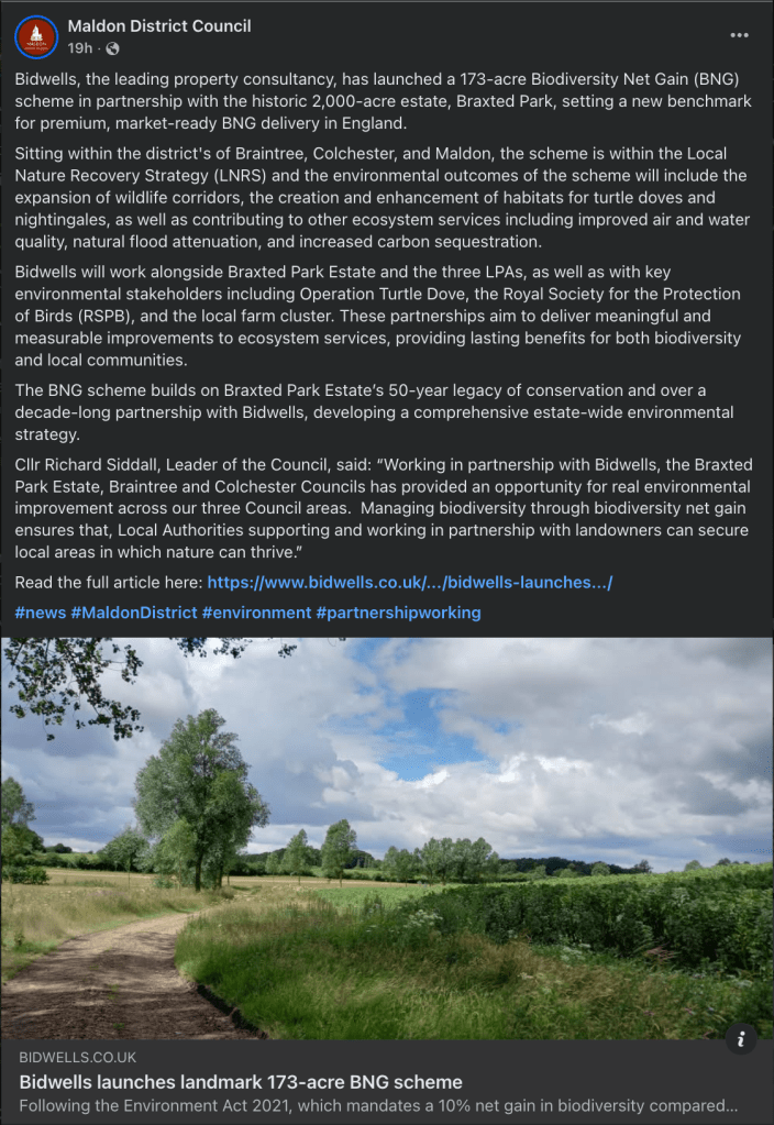 Yesterday, Maldon District Council (MDC) shared on social media that they would be working in partnership with a property consultancy company that has launched a Biodiversity Net Gain (BNG) scheme with the Braxted Park estate.