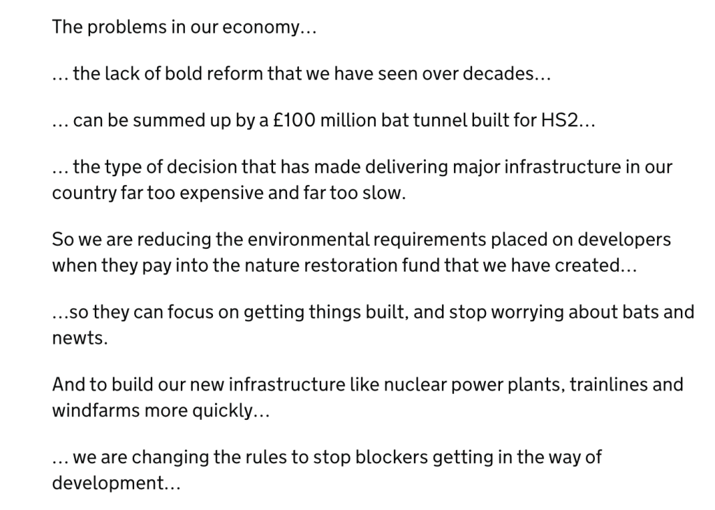 An ‘abundance’ YIMBYism is on the rise, an attitude on both the left and right of politics, and on both side of the Atlantic, that the future has been cancelled out of a gratuitous consideration for ‘bats and newts’, that we must just BUILD. Increasingly often this comes with a sanctimonious sneer that pits mitigating climate change against nature conservation “we could accelerate the construction of renewable energy infrastructure and energy efficient homes if you would just leave it out with bat tunnels and newt-counting delays”.