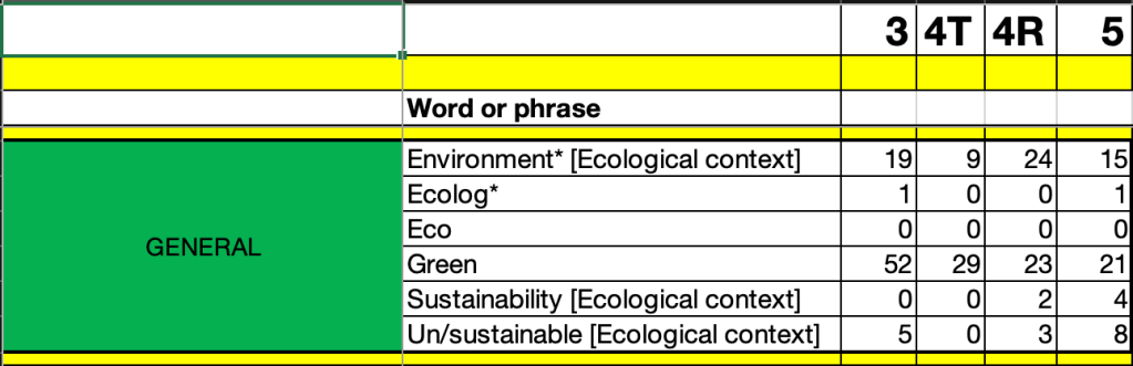 Words derived from the root ecology – ecology itself, ecological, ecologist etc, are almost entirely absent, appearing once each in two of the documents. The contraction ‘eco’ does not appear at all,