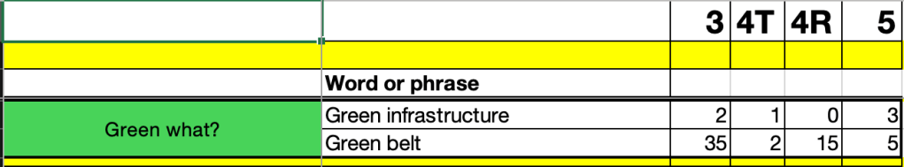 The favoured words are clearly ‘environment/al’ and ‘green’ which feature much more often – and to be fair are terms that ordinary people will commonly use. It’s probably worth noting that 45.6% of the times that the word ‘green’ appears in an ecological context it is within the phrase ‘green belt’ (68.6% in the Three unitary council proposal and 65.2% in the Four unitary council proposal (led by Rochford))