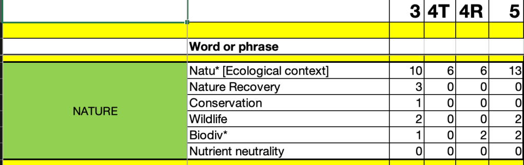 The phrase ‘nature recovery’ only appears in the Three unitary council proposal. This proposal was made by Essex County Council and the absence of ‘nature recovery’ in all the others perhaps indicates a failure to fully engage the other authorities in the county with this task.