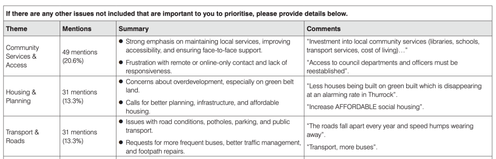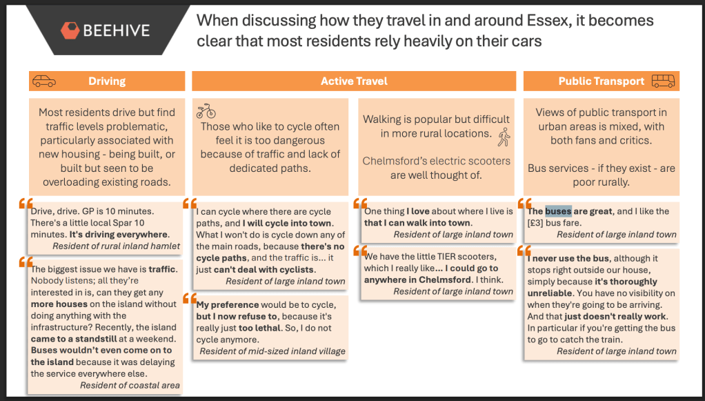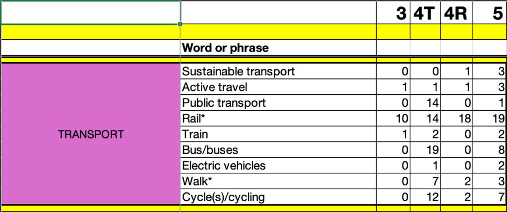 ‘Public transport’, ‘bus/buses’, and ‘electric’ [vehicles], are all missing from the Three unitary council proposal and the Four unitary council proposal (led by Rochford). The Three unitary council proposal is particularly lacking in this area with no mentions of ‘sustainable transport’, ‘public transport’, ‘bus/buses’, ‘electric vehicles’, ‘walk/walking/walker(s)’ or of ‘cycle(s)/cycling’. The amount of attention apparently given to this area by the the Four unitary council proposal (led by Rochford) is also deceptive as many of these words appear primarily in summaries of public responses to surveys saying what they would like rather than any clear strategy to deliver them (see slides below).