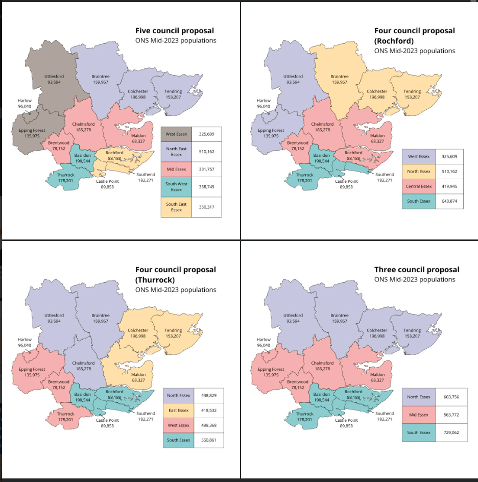 I’ve been reviewing the four competing proposals submitted by existing councils as to how that reorganisation should take shape. (They’re all published here). They divide Essex into 3,4 or 5 new unitary authorities: