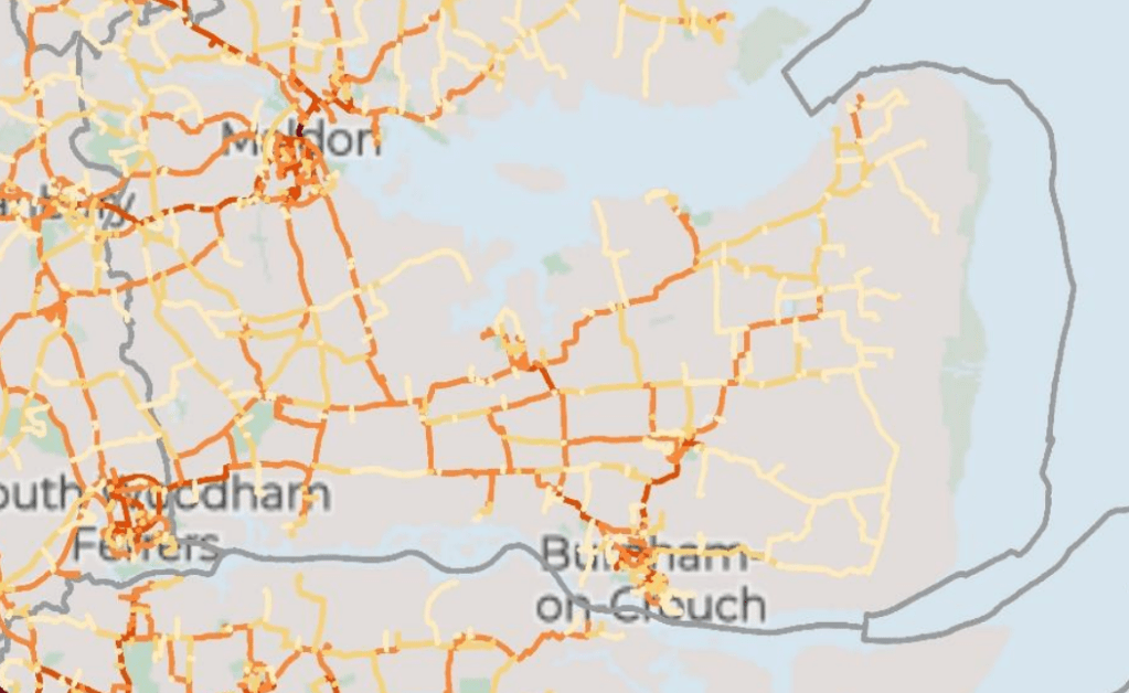 [As a reminder, settlements of 20k+ population each got their own Local Cycling and Walking Infrastructure Plan (LCWIP) while everywhere else in Essex was covered by the ‘Essex Wide’ plan. As no settlement on the Dengie reached the 20k threshold, the entire peninsula is covered by that plan. Maldon & Heybridge’s population combined exceeds 20K so they have a separate LCWIP. One of the maps in that document indicates a ‘secondary cycle route’ from Maldon into the Dengie using the B1010/Fambridge Road and ending abruptly at the Baron’s Lane junction]