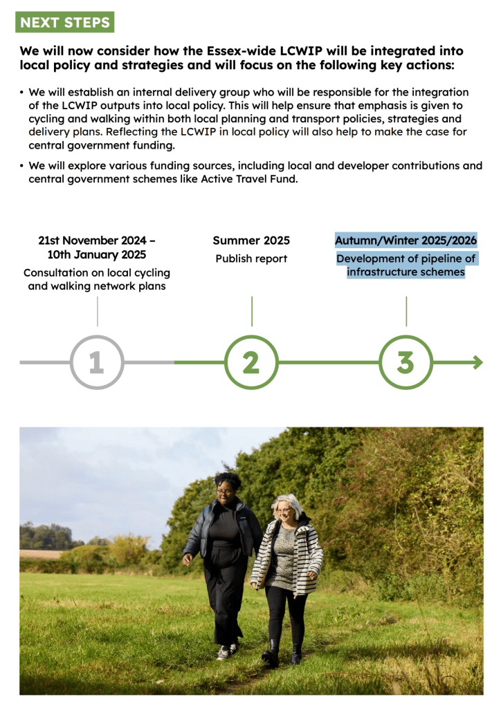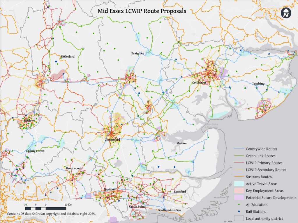 Like me, many of you may have responded to the Essex County Council consultation on the ‘Essex Wide Walking and Cycling Infrastructure Plan’. The results of that consultation were quietly released last August (2025), so you may not have seen them. I’m still working through the documents and I welcome comment and feedback from anyone else who braves them!