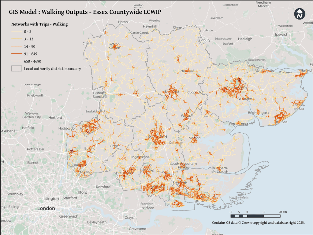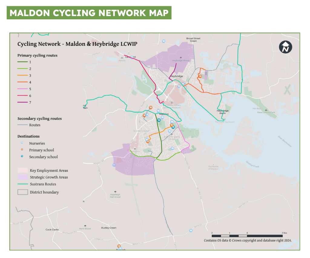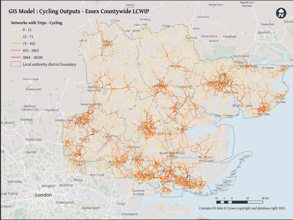 ‘Given the rural nature of the area [Essex], the plan prioritises cross-boundary connections between towns and cities, utilising off-road routes like Public Rights of Way (PROWs) and bridleways, and innovative on-road cycling solutions in constrained networks.‘
