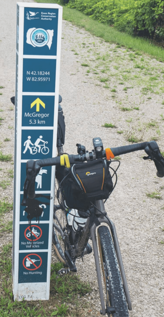 The Technical Report prepared by consultants WSP has a photograph on its first page of a rural cycle path, with a bike propped up against a smart wayfinding post which immediately had me wondering where in Essex this was, as I haven’t seen anything like it in the county before. I zoomed in to see more detail – at the top there’s a logo and text for the ‘Essex Region Conservation Authority’, neither of which I recognise, and the phrase ‘Essex Region’ sounds off. Below this are some co-ordinates that seem off too and a distance marker to somewhere called McGregor. The final square on the post has a person with a rifle on it and the legend ‘No Hunting’.