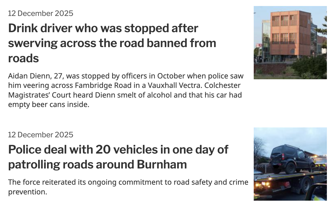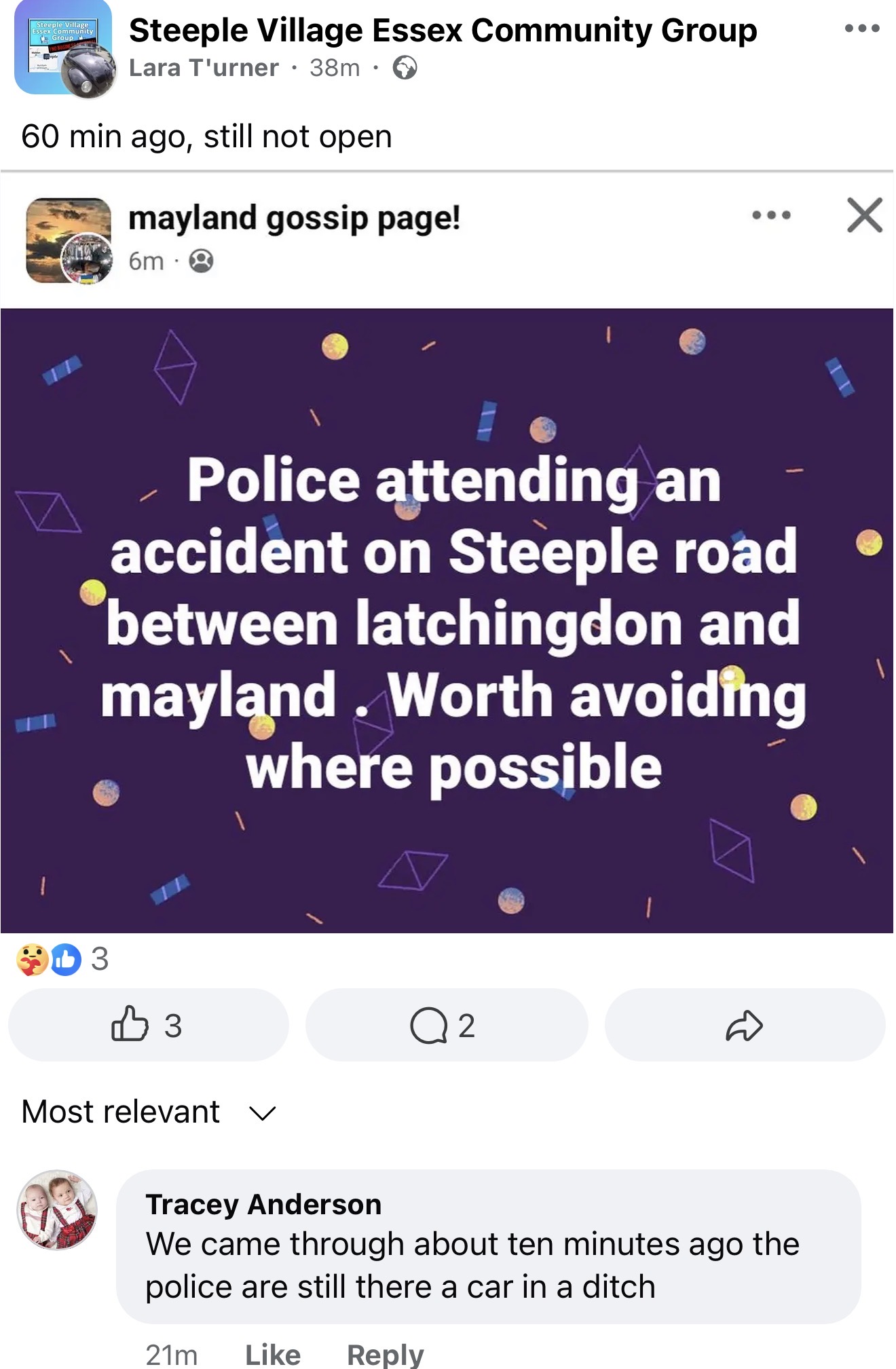 Barely a week goes by now without a collision on the Dengie roads. A couple of months ago this sadly included two fatalities. There’s clearly a problem with drunk and drug driving, but this appears to be a factor in only a minority of cases and doesn’t sufficiently explain the frequency of dangerous driving incidents. While excess speed is likely a factor, that doesn’t necessarily mean speeding —the recent Department of Transport study Road safety factors: initial analysis (30 May 2024) found that only 19% of fatal road collisions are recorded as a driver exceeding the speed limit. A fact which caused Sam Wakeling of campaign group Living Streets to ask: ‘Does that suggest that a whole lot of deadly speed is accepted within the legal limit? And that our speed limits are not set at safe levels?