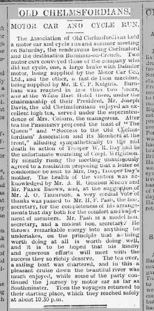 Apparently, Edmund Ernest Bentall of the Maldon agricultural equipment manufacturing family purchased a twin cylinder Georges Richard car in 1900 and become the first motorist in the district (Bentalls later made automobiles themselves) – but it looks like the Old Chelmsfordians may have beaten him out on to the peninsula, travelling as far as Southminster.