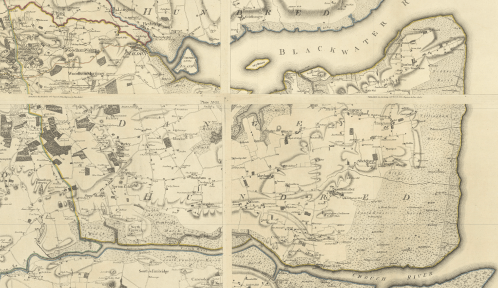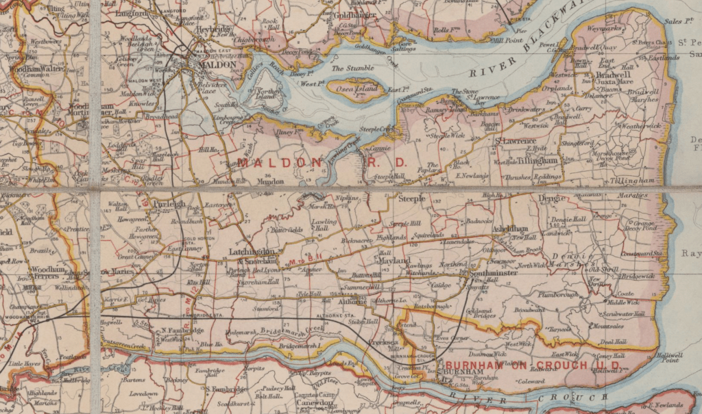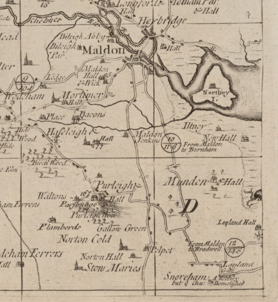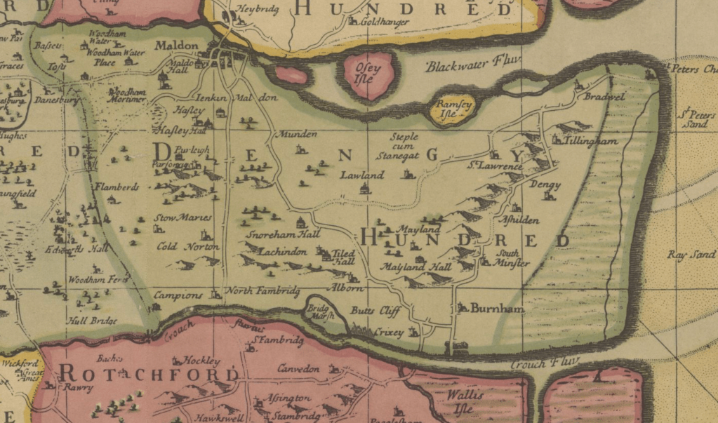 Much of the B1010, B1018 and B1021 to be, as well as the road running from Latchingdon through Steeple and St Lawrence to Bradwell are seen on the even earlier A map of the county of Essex: by a new survey … (1696) ‘performed by John Oliver’. Undoubtedly, these ways predate mapping and follow the lines of prehistoric pathfinding. They remain the ‘main arteries for the flow of commerce, goods and people‘.