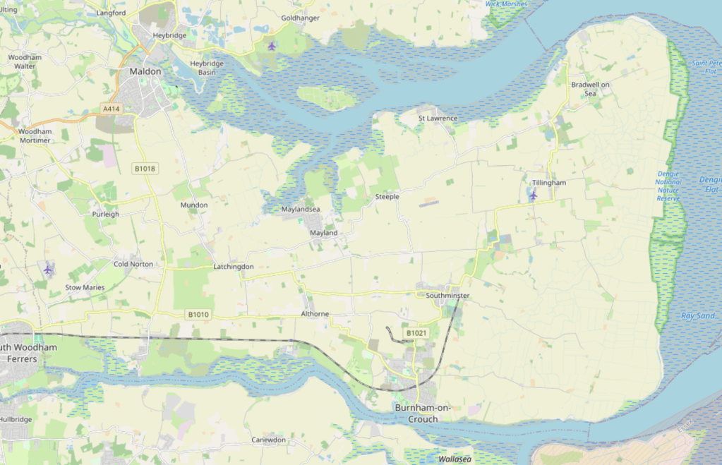 I’ve also looked for how Dengie routes could be connected both to the urban cycle networks in Maldon town and South Woodham Ferrers, and to the National Cycle Network (with connections to NCN 1 at Maldon, NCN 13 at Stock, and the proposed NCN 135 [pdf] at Battlesbridge.