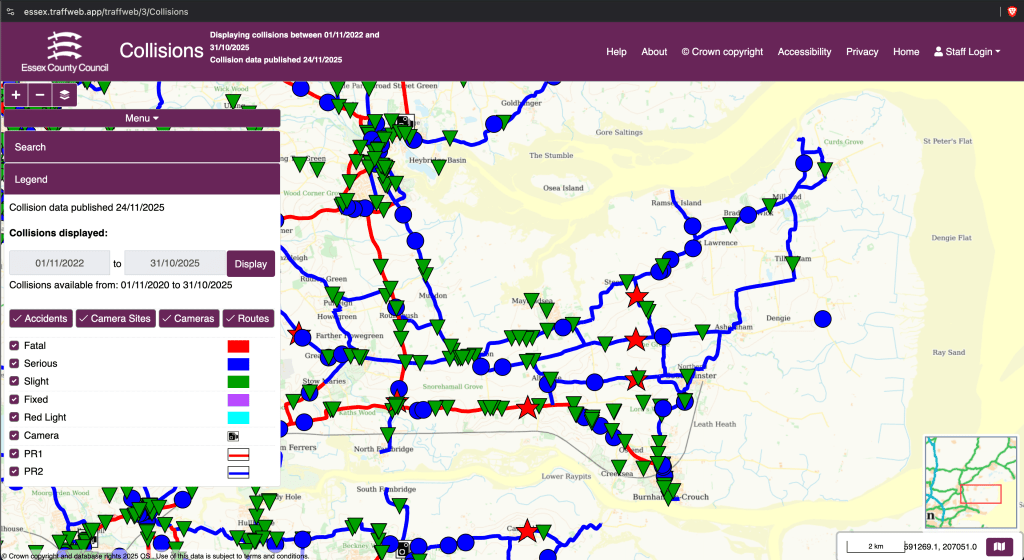 Maldon District currently has no roads designated with Quiet Lane status but I then proceeded to use roads which I think would be appropriate for such a status (avoiding the ‘priority’ PR1 and PR2 roads). Quiet Lane status should being slower speed limits and traffic calming infrastructure.